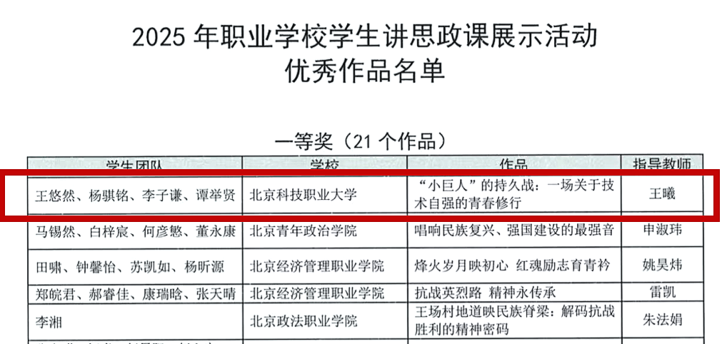 12月,学校正在“赓续红色血脉 激扬奋进力量——留念中国人平易近抗日和平暨世界反和平胜利80周年”2025年职业学校学生讲思政课展现勾当中荣获一等1项、二等1项。
