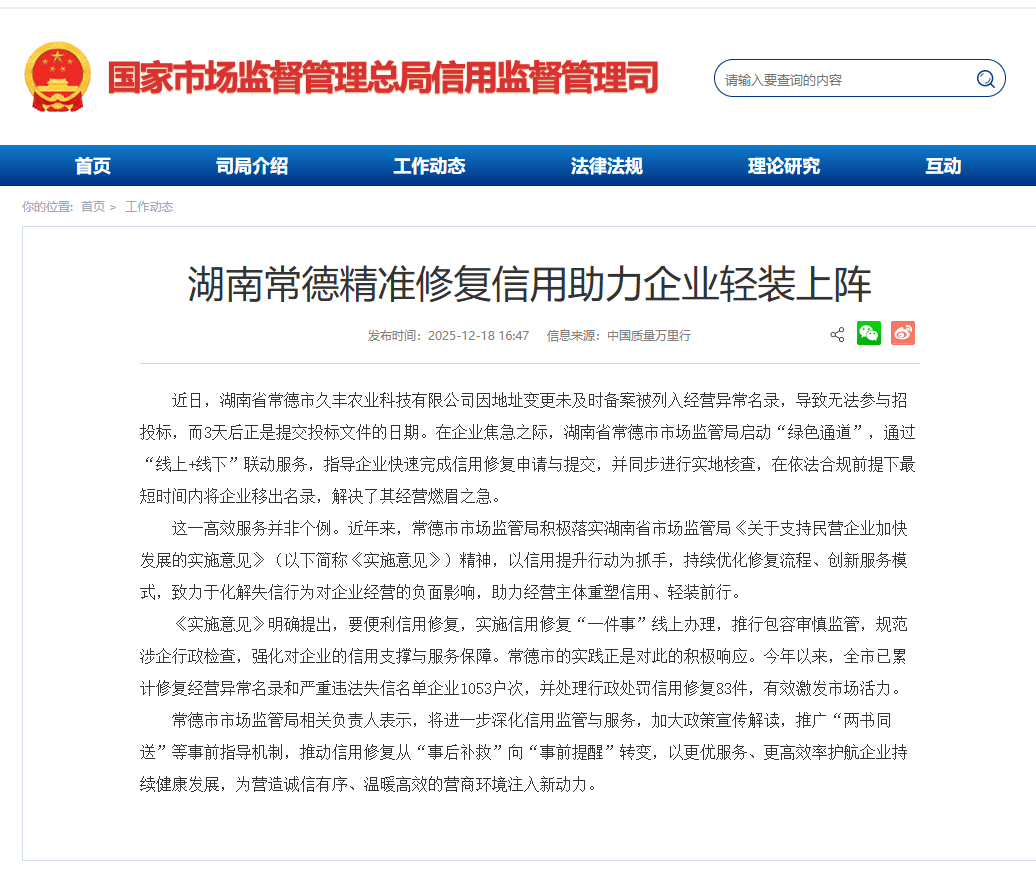 近年来,常德市市场监管局积极落实湖南省市场监管局《关于支撑平易近营企业加速成长的实施看法》,以信用提拔步履为抓手,持续优化修复流程、立异办事模式,努力于化解失信行为对企业运营的负面影响,帮力运营从体沉塑信用、轻拆前行。