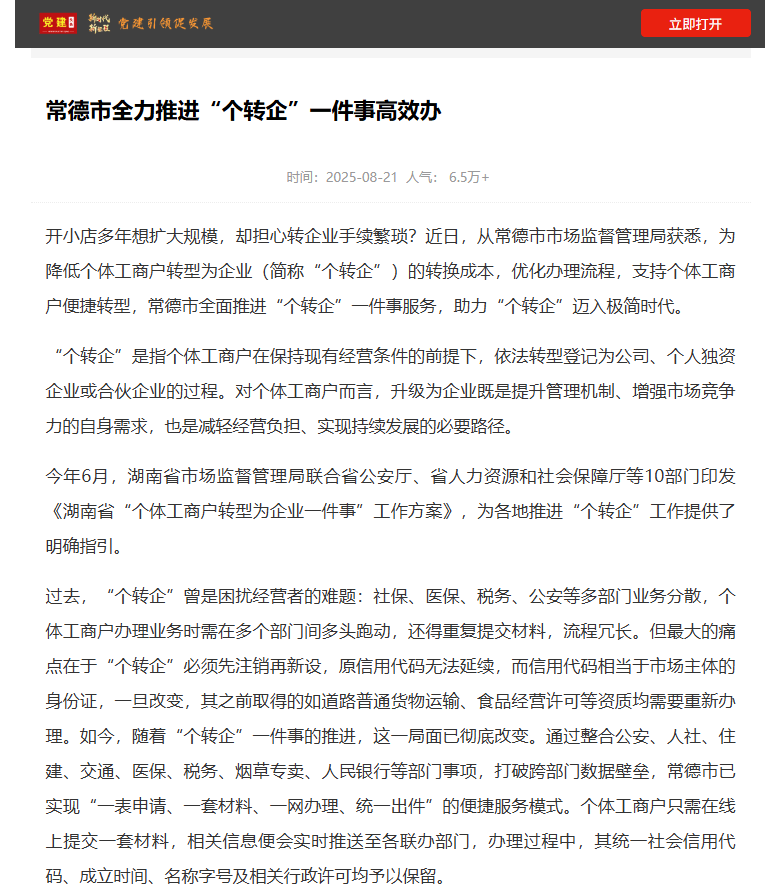 开小店多年想扩大规模,却担忧转企业手续繁琐?近日,从常德市市场监视办理局获悉,为降低个别工商户转型为企业(简称“个转企”)的转换成本,优化打点流程,支撑个别工商户便利转型,常德市全面推进“个转企”一件事办事,