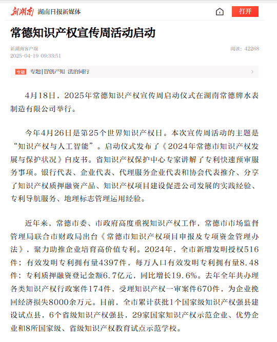 近年来,市委市高度注沉学问产权工做,市市场监管局结合市财务局出台《常德市学问产权项目申报及专项资金办理法子》,聚力帮推企业培育高价值专利。2024年,全市新增发现授权516件;无效发现专利具有量4397件,每万生齿无效发现专利具有量8。48件;专利质押融资登记金额6。7亿元,同比增加19。6%。客岁全年共打点各类学问产权行政案件174件,受理学问产权一审案件670件,为企业经济丧失8000余万元。目前,全市累计获批1个国度级学问产权强县扶植试点县、6个省级学问产权强县、29家国度学问产权示范企业、劣势企业和8所国度级、省级学问产权教育试点示范学校。